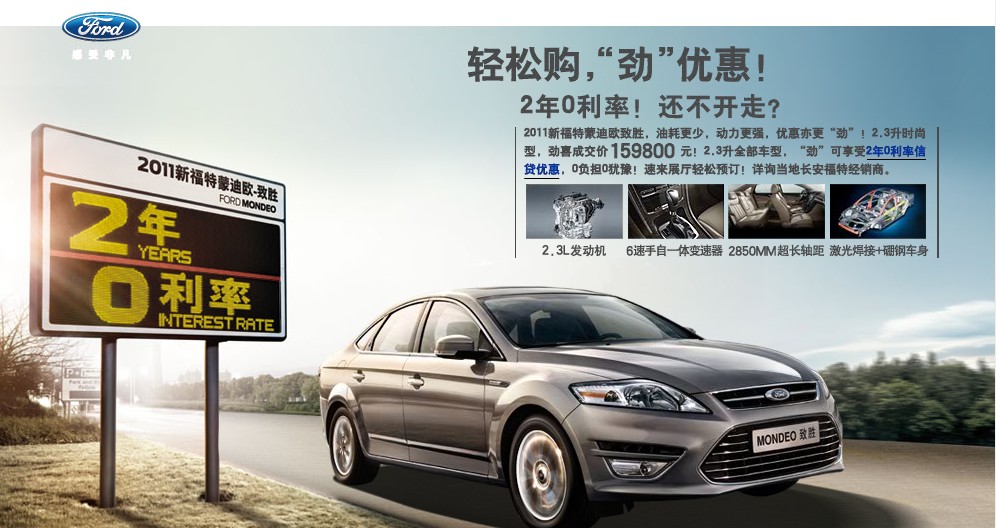2011新福特蒙迪歐-致勝,油耗更少,動(dòng)力更強(qiáng),優(yōu)惠更“勁”!2.3升時(shí)尚型,驚喜獎(jiǎng)僅15.98萬(wàn)元!2.3升全部車型,“勁”可享受2年0利率信貸優(yōu)惠,0負(fù)擔(dān)0猶豫!速來展廳輕松預(yù)訂!