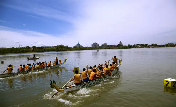 鼓聲三下紅旗開,兩龍躍出浮水來。棹影斡波飛萬劍,鼓聲劈浪鳴千雷。賽龍舟是端午節(jié)的習(xí)俗之一,起源可追溯至戰(zhàn)國。
