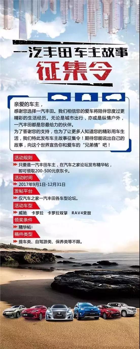 自2017年9月1日-12月31日,凡購(gòu)買了一汽豐田品牌的車主朋友,為自己的愛車拍攝一套精美的寫真集,加上自己的購(gòu)車經(jīng)歷及感受,在汽車之家論壇所屬的車型論壇中,發(fā)布帖子并且獲得汽車之家論壇認(rèn)可成為精華帖。完成以上步驟的朋友,請(qǐng)將精華帖鏈接、發(fā)帖昵稱、個(gè)人姓名及手機(jī)號(hào)碼私信發(fā)給“天嬌華運(yùn)通一汽豐田”公眾微信號(hào)(每月10號(hào)之前提交上月精華帖,逾期無效),經(jīng)過工作人員回復(fù)后,即可獲得200-500元京東卡!就這么容易!