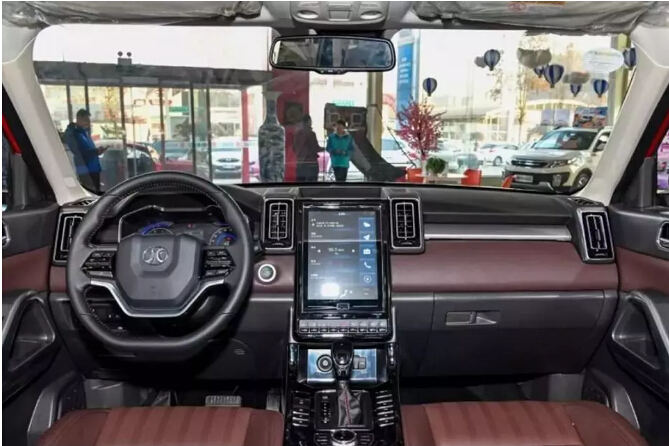 內(nèi)飾的材質(zhì)和設(shè)計(jì)倒是配得上車型的名稱和外觀,因?yàn)槲覀冊(cè)谲噧?nèi)能看到皮質(zhì)包裹的前臺(tái),超大中控屏幕,寬厚的擋把區(qū)等實(shí)力元素,還有就是空調(diào)出風(fēng)口漢字造型霸氣十足。