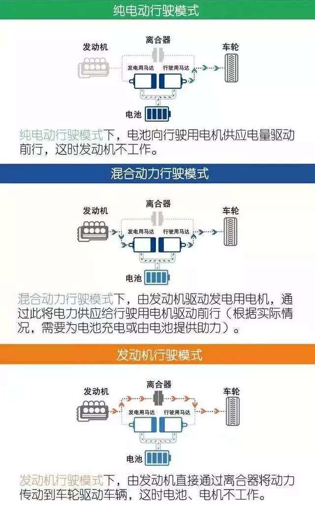 上圖清晰的展示了本田第三代i-MMD混動系統(tǒng)工作原理以及工作模式。