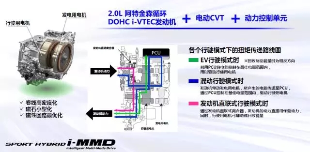 本田i-MMD混動(dòng)系統(tǒng)由2.0L阿特金森循環(huán)發(fā)動(dòng)機(jī)、動(dòng)力控制單元PCU、高功率電機(jī)、以及大容量鋰離子電池組成,可根據(jù)道路條件的不同自動(dòng)切換行駛模式。這套混動(dòng)系統(tǒng)最主要的特點(diǎn)是,它不僅可以像其它混動(dòng)系統(tǒng)一樣提供出色的燃油經(jīng)濟(jì)性,而且對(duì)動(dòng)力響應(yīng)的要求也絕不降低,所以被稱為運(yùn)動(dòng)型混合動(dòng)力系統(tǒng)。