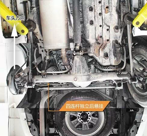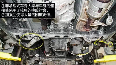 車身大梁中部有加強肋,大大提高了剛度,大梁與車身的連接處使用了較厚的橡膠襯套,慮振效果較好。油箱有金屬蓋板保護,上面有導流槽以及通風孔,有利于氣流快速通過并且?guī)ё邿崃俊!≈醒氩钏倨鲙Р钏冁i,為托森限滑差速器類型。 后為開放式差速器,不帶差速。前后減震支柱均為日本制造。