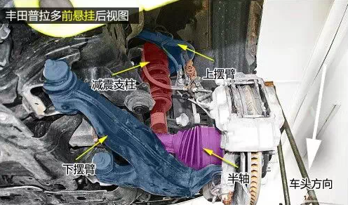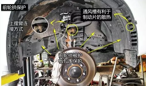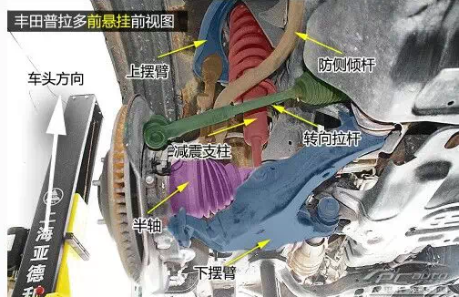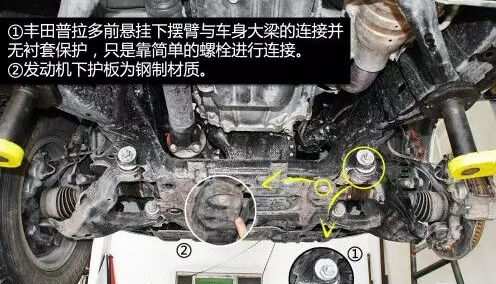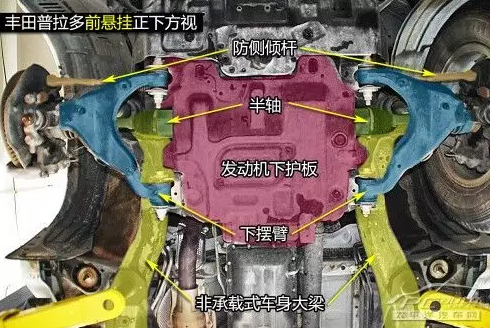 普拉多前雙叉臂式獨立懸掛在空間利用率方面雖稍遜于麥弗遜懸掛,但兩者結構都是相當緊湊的,且由于多了上擺臂,在抓地性和防側傾等方面的表現(xiàn)都要比后者優(yōu)秀。普拉多發(fā)動機下方有護板保護,且為鋼制。在下擺臂和車身大梁的連接方面則是使用較為簡單的螺栓連接。
