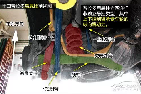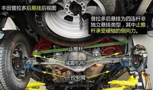 普拉多后四連桿結構帶止推桿,止推桿一頭連接在車身上,一頭連接到硬軸上,承受硬軸的側向力作用,上下控制臂則承受車輪的上下跳動力。后懸掛減震彈簧頂部內(nèi)嵌有橡膠,在彈簧壓縮至極致時起到緩沖保護作用。