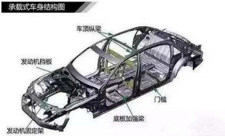 承載式車身多用于轎車或城市SUV,車身沒有獨立車架,車身結(jié)構(gòu)件和底盤一體成型,然后添加上車身覆蓋件(發(fā)動機艙蓋、車門、車頂?shù)龋?。承載式車身在鋼性上較弱,車輛的承載能力也是相當有限的。