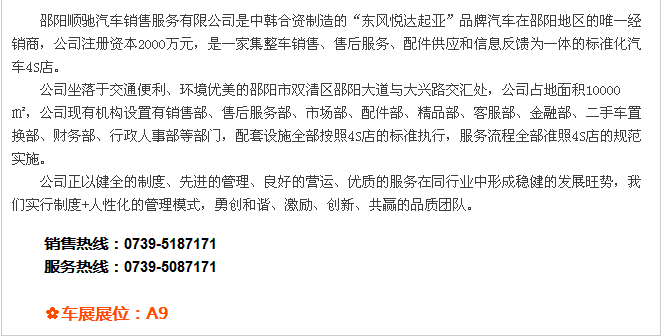 【915-918邵陽(yáng)秋季車(chē)展】 9月15日-9月18日,2017湘西南第二屆汽車(chē)文化節(jié)暨(北京現(xiàn)代領(lǐng)動(dòng))邵陽(yáng)秋季車(chē)展將于天嬌國(guó)際汽車(chē)城隆重舉辦。本屆車(chē)展由邵陽(yáng)市政府批準(zhǔn)、邵陽(yáng)市汽車(chē)行業(yè)商會(huì)主辦、北京現(xiàn)代領(lǐng)動(dòng)冠名,邵陽(yáng)順馳起亞、獵豹汽車(chē)、永馳東南汽車(chē)、邵陽(yáng)眾泰汽車(chē)、和昌長(zhǎng)安汽車(chē)、邵陽(yáng)三馬名車(chē)、天嬌福特、大漢通寶寶馬、邵陽(yáng)新奧奧迪協(xié)辦,合作銀行為:中國(guó)農(nóng)業(yè)銀行股份有限公司邵陽(yáng)分行。此次車(chē)展不僅僅是一場(chǎng)視覺(jué)的盛宴,更是一場(chǎng)震撼的汽車(chē)文化之旅!今天小編就給大家著重介紹一下此次車(chē)展冠名及協(xié)辦單位。