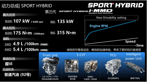 混動(dòng)版車型搭載的是本田引以為傲的第三代i-MMD混合動(dòng)力系統(tǒng),其中2.0L阿特金森循環(huán)發(fā)動(dòng)機(jī)的最大功率為107kW,最大扭矩為175N?m,電動(dòng)機(jī)的最大功率為135kW,最大扭矩為315N·m;與之匹配的是E-CVT變速箱。燃油版及銳·混動(dòng)版均有四驅(qū)系統(tǒng)可選擇。