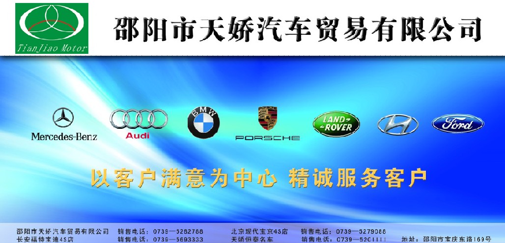 經(jīng)湖南省邵陽市人民政府批準,邵陽市第四屆汽車博覽會定于2011年9月23日至9月25日在邵陽市魏源廣場隆重舉行。本次車展由邵陽電視臺主辦、邵陽市汽車行業(yè)商會、邵陽市交警協(xié)辦,30余家汽車經(jīng)銷商共同參與的一次盛大的汽車博覽會,天嬌集團旗下的寶迪4s店,寶京4s店,恒泰名車店經(jīng)營有奧迪、奔馳、寶馬、保時捷、路虎、現(xiàn)代、福特,屆時恭迎您的大駕光臨。